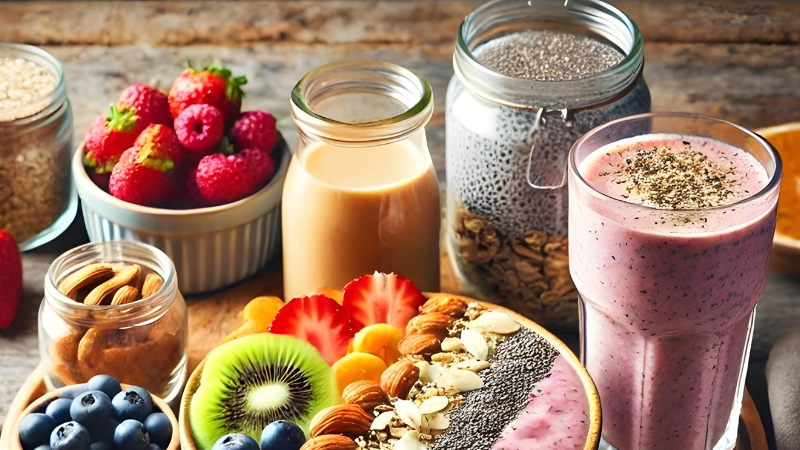 - Ingredients: Banana, pea protein powder, chia seeds, almond milk, berries